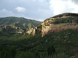 The park is 320 km (200 mi) from Johannesburg and is close to the villages of Clarens and Kestell, in the upper regions of the Little Caledon River.[4] The park is situated in the Rooiberge of the eastern Free State, in the foothills of the Maluti Mountains. The Caledon River forms the southern boundary of the park, as well as the border between the Free State and Lesotho. The elevation ranges from a 1,800 m (5,900 ft) plateau in the north to heights of 2,700 m (8,900 ft) in the south.[9] The highest peak in the park (and also in the Free State) is Ribbokkop at 2,829 m (9,281 ft) above sea level.[6]