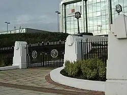 - The Firestone Tyre Company. Built 1928, designed by Wallis, Gilbert and Partners.[3][4] It was the first overseas factory built by the Firestone company of America. The building frontage was demolished during a public holiday in August 1980 shortly before a preservation order was due to be served on it to retain the Art Deco architecture.[5][6] The Art Deco gatehouse was demolished in 2004 to make way for increased parking facilities. The remaining gates, railings, and piers are in a Jazz Modern style and are Grade II listed.[4]