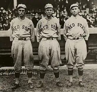 The Golden Outfield, also called the Million Dollar Outfield, were the three starting outfielders of the Boston Red Sox of Major League Baseball from 1910 through 1915, considered one of the greatest outfields of all time.[1][2] The three members of the Golden Outfield were left fielder Duffy Lewis, center fielder Tris Speaker, and right fielder Harry Hooper. The three helped the Red Sox win two World Series titles, in 1912 and 1915. Two members of the Golden Outfield, Speaker and Hooper, are enshrined in the Baseball Hall of Fame.[2][3][4] All three were effective hitters, but were especially known for their fielding skill.[5][6] Baseball writer Grantland Rice said that they were "the greatest defensive outfield I ever saw...They were smart and fast. They covered every square inch of the park – and they were like three fine infielders on ground balls. They could move into another country, if the ball happened to fall there."[1] Speaker, Hooper, and Lewis all had powerful throwing arms, as well. Both Ty Cobb and Babe Ruth said that it was the best outfield that they had ever seen.[7]