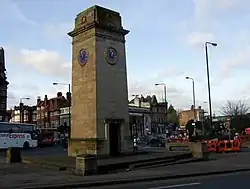 The Golders Green War Memorial is a war memorial in Golders Green, North London, United Kingdom.[1] The memorial, which takes the form of a clock tower, was dedicated on 21 April 1923.[1][2] It commemorates both victims of World War I and World War II.[1] The names of the honoured are written on a bronze wall plaque for World War I and on a bronze book for World War II. The name of Captain M Allmand VC was added at a later date to the victims of World War II.