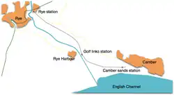 The Rye and Camber Tramway was an English railway in East Sussex. It was of 3 ft (914 mm) narrow gauge, relatively unusual amongst British narrow gauge railways. It operated from 1895 until 1939, connecting Rye to the coast. It was about 1+3⁄4 miles (2.8 km) in length, and had three stations – Rye, Golf Links and Camber Sands. It operated mainly to transport golfers to the golf links and holidaymakers to the coastal dunes.