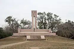 The Goliad massacre contributed to the frenzy of the Runaway Scrape. After the executions, the Texians' bodies were piled and burned.[28] Their charred remains were left in the open, unburied, and exposed to vultures and coyotes.[28] Nearly one month later, word reached La Bahia (Goliad) that Santa Anna had been defeated and had surrendered while trying to flee at the Battle of San Jacinto.[29] General Thomas J. Rusk found the remains of the massacre victims in June 1836 and gave orders for a formal military funeral. The remains were interred at a location southeast of the Presidio la Bahia. This has since been preserved and designated as the Fannin Memorial Monument. The location of the gravesite was forgotten until 1930, when human bone fragments were discovered by a group of Boy Scouts and their leader.[30] The massacre is commemorated in Walt Whitman's poem Song of Myself, section 34. This is featured in his collected poems titled Leaves of Grass.[31] In 1939, the Fannin Memorial Monument by Raoul Josset was erected at the gravesite. It features an art deco relief sculpture and the names of the men who were killed.[32]370 known names of the dead [33]