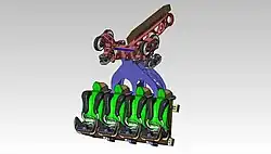 Goliath featured a train by Premier Rides, which was unlike the other Giant Inverted Boomerang installations. It featured a seating layout of four riders per row directly in line with one another, identical to the layout used on inverted coasters from Bolliger & Mabillard. It was chosen to make the boarding in the station less confusing and complicated, while also increasing rider capacity.[14][15] However, this train caused the ride experience to become rougher.[16]