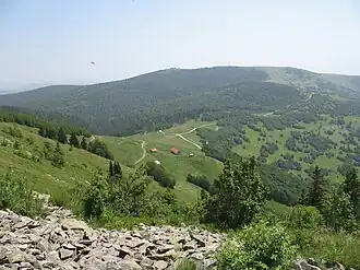 The highest peak is Jankov Kamen 1,833 metres (6,014 ft). It was named after Sibinjanin Janko, Serbian romanticized version of Hungarian medieval knight John Hunyadi. According to local myths, when he was returning to Hungary after the Second Battle of Kosovo in 1448. He placed a stone on top of the mountain to mark his presence, hence the name which is Serbian for "Janko's stone".[3] The highest peak is followed by Radulovac (1,785 metres (5,856 ft)), Bojevo Brdo (1,748 metres (5,735 ft)) and Crni Vrh (1,725 metres (5,659 ft)). The peaks offer sightseeing to Golija's forests and pastures, as well as the peaks of nearby Kopaonik, Komovi and Prokletije mountains. On a clear day, even a distant mountains, like Durmitor in Montenegro or even Kosmaj, close to Belgrade,[3] are visible.