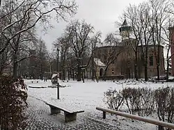 One of the first buildings in the squares south side was the two-wing school built by Carl Hocheder between 1889 and 1891. From 1901 to 1903, Gabriel von Seidl built the parish church of St. Rupert to the west of the school building in a neo-Romanesque style.[4] It was not until 1926 that Ludwig Naneder added the parsonage with its hipped roof. In 1902 the striking corner house Kiliansplatz 6 with two staggered gables and a corner oriel in Neo-Renaissance style was built. At the beginning of the 20th century, several apartment buildings in late Art Nouveau style followed on the north side of Gollierplatz.