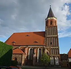 The town was first mentioned, as Calowe, in 1279.[4] Its name is of Slavic origin and comes from the old Sorbian and Polish word kał, which means "swamp" or "bog".[4] The town was at various times ruled by Bohemian, Hungarian, Saxon and Polish monarchs, before it was annexed by Prussia in 1815. It was located on an important trade route, called the "Salt Road", which was used to transport salt from Halle to Lusatia and further east to Poland.[5] From 1815 to 1947, Calau was part of the Prussian Province of Brandenburg.