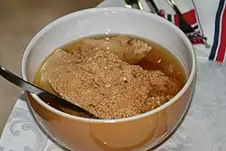 Gomme is commonly a form of sweet cheese made of long-boiled milk and having a yellow or brown colour. It can be used as a cheese spread on slices of bread, lefse, or waffles. There are several regional and local variants. There also exists a porridge-like variant made of boiled milk with oat grain or rice. It can be served as a dessert with vanilla, cardamom, raisins, and cinnamon as added ingredients in most variants. The consistency can vary from soft to thick.[2][3]