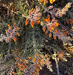 Gompholobium polyzygum is an erect or prostrate shrub that typically grows to a height of 0.3–1.5 m (1 ft 0 in – 4 ft 11 in) with its branchlets densely covered with spreading or curly hairs. Its leaves are pinnate with sixteen to twenty-one pairs of elliptic to more or less round or egg-shaped leaves with the narrower end towards the base, 2–3.5 mm (0.079–0.138 in) long and 1.6–3.3 mm (0.063–0.130 in) wide. The leaves are on a petiole 1.3–3 mm (0.051–0.118 in) long, the leaflets on petiolules 0.3–0.4 mm (0.012–0.016 in) long. The flowers are borne in racemes of between five and sixteen on a peduncle 6–14 mm (0.24–0.55 in) long, each flower on a pedicel 4–10 mm (0.16–0.39 in) long. There are bracts 3.5–10 mm (0.14–0.39 in) long at the base of the flowers and hairy bracteoles 3.1–9.5 mm (0.12–0.37 in) long on the upper part of the pedicels. The sepals are fused at the base forming a tube, the upper lobes 5.1–7.0 mm (0.20–0.28 in) long and the lower lobes 5.3–6.5 mm (0.21–0.26 in) long. The standard petal is yellow-orange and 9.5–11.8 mm (0.37–0.46 in) long, the wings 10–12 mm (0.39–0.47 in) long and the keel orange or yellowish green and 10–12 mm (0.39–0.47 in) long. Flowering occurs from July to October and the fruit is a pod 5.5–7.0 mm (0.22–0.28 in) long.[2][3]