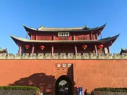 The Gongchen Tower was built in 1390, the 23rd year of the Hongwu reign during the Ming dynasty, on top of the northern gate of the Weishan (then called Menghua) city wall.[1] The city wall originally had five towers, but only Gongchen and Wenbi (文笔楼) towers survived until modern times.[2] Being more than 600 years old, Gongchen Tower was one of the oldest and best preserved ancient towers in Yunnan until its destruction by fire. It was considered a symbol of Weishan, and was listed as a key cultural protection site by the Dali Bai Autonomous Prefecture in 1988.[1]