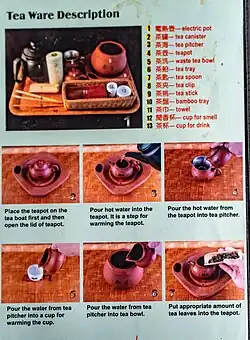 Below is a list of the main items used in a gongfu tea ceremony in Taiwan, known there as laoren cha (老人茶; lǎorénchá; 'old men's tea').[13]