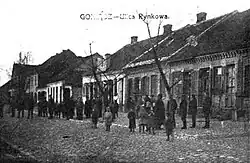 The Germans occupied the town for ten days in September 1939 and burned the synagogue prior to handing the town over to Soviet forces in accordance with the Molotov–Ribbentrop Pact. The town was reoccupied by the Germans on 26 June 1941 and after consulting with the local priest they appointed a collaborationist town council led by Jan Balonowski.[4] On 2 July 1941 after a few Jews were found hiding in surrounding villages, the town council ordered that "All Jews present in nearby villages are ordered to return to town. Any farmers caught harboring a Jew will be shot alongside the Jew".[5] On 4 July, an SS unit arrived in the town, assembled the Jews and humiliated them, and prior to leaving gave the Blue Police a free hand in regards to alleged communists. Some prisoners were released in exchange for payment, but others were tortured or beaten to death. Survivor estimates vary between 20 and 180 dead alleged communists (mainly Jews, some Poles). On 6 July 1941, five Jewish youths were killed by German soldiers after they were caught by the Blue Police outside of town. On 20–21 July 1941, a Polish officer of the Blue Police, probably overseen by a small SS unit, instigated a pogrom in which 20 Jews were killed. Following the pogrom, and threatened with further violence, Jewish women conscripted for labor at the German military command at Osowiec, appealed for help from the local German colonel. The colonel dispatched a German military police unit which arrested and then executed six of the perpetrators for stealing Jewish property.[4]