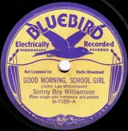 Sonny Boy Williamson I recorded "Good Morning, School Girl" in 1937 during his first recording session for Bluebird Records.[1] The song is an uptempo blues with an irregular number of bars.[3] Although identified with Chicago blues, a write-up in the Blues Hall of Fame notes "it was a product of Sonny Boy’s west Tennessee roots and his pre-Chicago ensemble work".[1] The melody has been traced to “Back and Side Blues”, a 1934 blues song recorded by Son Bonds. "Good Morning, School Girl" features Williamson's vocal and harmonica with accompaniment by Big Joe Williams and Robert Lee McCoy (also known as Robert Nighthawk) on guitars.