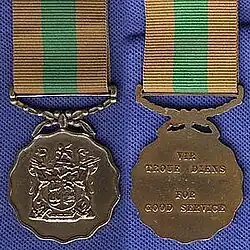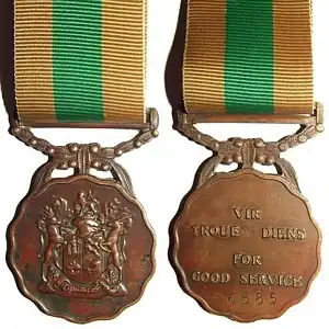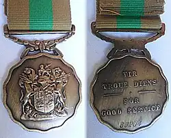 The Good Service Medal, Bronze, originally named the South African Defence Force Good Service Medal, Bronze, is the junior of a set of three South African military medals which was instituted by the Republic on 1 July 1975. It was awarded to members of all elements of the South African Defence Force for ten years of exemplary service, but was restricted to Permanent Force personnel from 1993.[1]