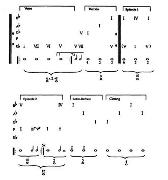 The abstract structure of "Good Vibrations" complicates formal analysis of the next sections.[54][40] In a typical song structure, the sections following the second refrain might function as a single extended bridge[54] or two distinct bridge sections.[78] Harrison termed it an "episodic digression", arguing that although the first part of the bridge is an unusual but plausible break between the verse and refrain, the second part challenges this interpretation, indicating a structure that evolves independently of standard song forms.[147] Starr similarly describes its structure as unique and without a definitive classification, calling it as distinctive as the rest of the recording.[40] He suggests that "development", a term typically associated with classical music, could best describe its form, which he partitions into sections designated as A, B, C, D, and "variations on B".[148][nb 19] Covach, using numerical labels in his formal analysis, states that while the song does not conform to conventional pop forms, it broadly follows a pattern in which contrasting material appears after the second chorus.[150]