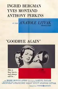 Goodbye Again (released in Europe as Aimez-vous Brahms?)[4] is a 1961 American-French romantic drama film produced and directed by Anatole Litvak. The screenplay was written by Samuel A. Taylor, based on the novel Aimez-vous Brahms? by Françoise Sagan. The film, released by United Artists, stars Ingrid Bergman, Anthony Perkins, Yves Montand, and Jessie Royce Landis.