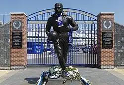 The area around Goodison Park when built was full of terraced housing, including Goodison Avenue behind the Park End stand. Oddly, housing was built right into the stand itself (as shown on old photographs of Goodison and in programmes). The club had previously owned many of the houses on the street and rented them to players. One of the players to live there, Dixie Dean, later had a statue erected in his honour near the Park End on Walton Lane.[15] By the 1990s, the club had demolished virtually the whole street and this coincided with the redevelopment of the Park End stand. However, at present the majority of the land is now an open car park for the club and its marquee.