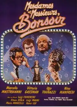 Goodnight, Ladies and Gentlemen (Italian: Signore e signori, buonanotte, French: Mesdames et messieurs bonsoir) is a 1976 French-Italian satirical comedy anthology film. It comprises twelve episodes on themes of corruption in various Italian institutions, each by a different writer and director collectively credited as "Cooperativa 15 Maggio". The episodes are a satire of a typical programming day of an Italian public broadcaster, with a fictional TG3 journalist (Marcello Mastroianni) interviewing a number of the other characters. The film stars Vittorio Gassman, Ugo Tognazzi, Nino Manfredi, Paolo Villaggio, Marcello Mastroianni, Senta Berger, Adolfo Celi, and Felice Andreasi.[1]