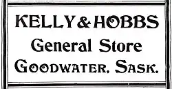 Arthur Kelly (b. 1850, Devonshire, England) and William "Billie" Hobbs first established their general store in a tent in 1910, selling "everything from needles to threshing machines."[23] In 1925, Arthur Kelly sold his interest in the general store to Billie Hobbs who, in 1933, sold the general store to Kelly's son, Arthur Kelly, Jr.[23] Third-generation Clair Arthur Kelly took over the general store (and served as Postmaster), later selling it in 1953 to Norman Lucas who ran the store and served as Postmaster until 1960.[24]