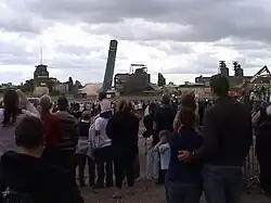 Work started on building the chimney in October 1927, with the mayor of Wolverhampton laying the first brick.[3] In 2008 the factory and chimney were demolished. An Oxley primary school pupil and a former Goodyear worker had the privilege of pressing the firing button.[1]
