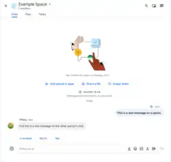Spaces, originally called Rooms, is a chat room feature built within Google Chat for topic-based collaboration, with shared files, tasks and conversations.[23][24] It functions alongside Google Chat and Google Meet to integrate group productivity features like message threading and real-time collaboration to organize topic-based conversations without exiting Gmail.[25] The feature revives the brand name previously used in a similar standalone service of the same name from 2016 to 2017, with the rebranding occurring as part of the expansion of Google Workspace to all users in 2021.[26][27] Spaces are designed for collaboration on long-term projects. In contrast to spaces, group conversations only support chatting and do not have any task functionality or a separate files tab to view a list of shared files.[28] Spaces also allow users to change the name of the chat, which is not possible with group conversations, and they allow users to only be notified when they are mentioned.[29] Each space has three tabs, a chat tab for chatting, a files tab for sharing files, and a tasks tab for creating and assigning tasks.[29]