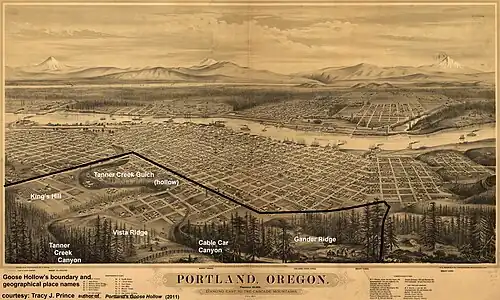 Goose Hollow is a neighborhood in southwest Portland, Oregon. It acquired its distinctive name through early residents' practice of letting their geese run free in Tanner Creek Gulch and near the wooded ravine in the Tualatin Mountains known as the Tanner Creek Canyon.[2][3] Tanner Creek Gulch was a 20-block-long, 50-foot-deep (15 m) gulch (or hollow) that started around SW 17th and Jefferson and carried the waters of Tanner Creek into Couch Lake (now the site of Old Town/Chinatown and the Pearl District). Over a century ago, Tanner Creek was buried 50 feet (15 m) underground (where it still drains the West Hills), and the Tanner Creek Gulch was filled in.[4] The only remaining part of the hollow is the ravine, Tanner Creek Canyon, carved out by Tanner Creek through which The Sunset Highway carrying US-26 passes and which the Vista Bridge spans, also called the Vista Viaduct.[5]