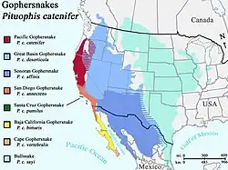 As of 2022, nearly unanimous agreement exists on the recognition of six subspecies, occurring from southern Canada, the continental United States, and Mexico. However, no full agreement is found among taxonomists on the status of populations from Baja California and some offshore islands; the Cape gopher snake (Pituophis catenifer vertebralis) and central Baja Californian gopher snake (P. catenifer bimaris) are recognized, by some sources, as a single species (with no subspecies vertebralis). Some other sources, alternatively, consider it a species with two subspecies: P. v. vertebralis and P. v. bimaris. Other subspecies, including the Coronado Island gopher snake (P. catenifer coronalis) and San Martin Island gopher snake (P. catenifer fulginatus) are of questionable validity.[4][9]