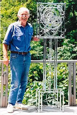This led to a One Man Clock, a Three Man Clock (the Clock Junior), a Water Clock (Bradt, 1990), and eventually to a Seven Man Pedestal Clock. Bradt was issued a U.S. patent in 1992 for the pedestal device, titled "Animated Kinetic Sculpture Device" (Bradt, 1992). Soon Bradt was building Grandfather Clocks in his studios based on the Seven Man Clock. These chrome plated 6 ft. tall clocks were sent to dealers and collectors around the world.[17] On February 2, 1993, Bradt's Grandfather Clock and Kinetico won Best in Show in "Gallery of Design and Innovation" at the Jewelers of America Show held in New York City. In addition to Best in Show, Kinetico also won First Place in the Innovative Design category at the show.[18][19]