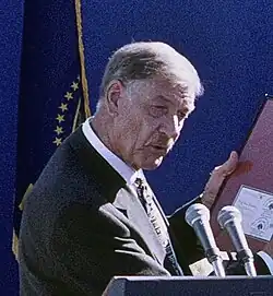 After leaving office he planned to learn to play a musical instrument, learn to use a computer, and take some college level history classes.[20] Faber suffered a heart attack a few years after leaving office, but survived.[21] His marriage to his first wife, Barbara, having ended, Faber remarried in 1990 to B. J. Jeddeloh (also Barbara).[2] Faber was known for his sense of humor, which included an episode where he carried an axe while wearing an executioner's hood to the performance review of the city's manager.[2] A scholarship is given in his name by the Hillsboro Community Foundation for local students pursuing nursing careers.[22] In 2014, he began receiving hospice care at home due to chronic obstructive pulmonary disease.[23] Gordon Faber died on August 18, 2014, at home at the age of 83 due to chronic obstructive pulmonary disease.[24]