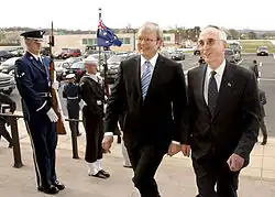 On January 22, 2009, Secretary of Defense Robert Gates told reporters he would hand off his duties to Gordon R. England during his January 23 surgery.[3] On January 23, 2009, while Gates underwent two hours of surgery to repair a torn tendon in his left biceps, Gordon England was in charge of the Pentagon. England continued this service while Gates recovered from the surgery.[4] During this time, England was the acting Defense Secretary.[5]