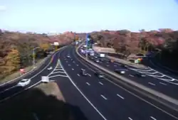 In road and highway construction, a gore (or nose in modern British English)[1] is a triangular plot of land as designated when a road forks at the intersection with second road, or merges on and off from a larger one. A "virtual" (or theoretical) gore is a triangular shaped space, characteristically marked off with distinguishing highway paint, often found leading to the unpaved area of a larger physical gore.