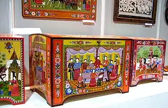 Gorodets artists traditionally have painted genre scenes (including merrymaking, tea drinking, the famous Gorodets horse with a horseman, and folk festivities), decorative images of birds and animals (including roosters, horses, lions, and leopards), and flower patterns.[2] Nowadays Gorodets craftsmen use similar imagery and motifs in their works. These are decorative panels, caskets, boxes, various sets of kitchen stuff, such as hardboards, bread bins, saltcellars, children furniture and toys, including the most popular the painted rocking horse.
