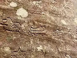 They depict boats, chickens, dogs, owls, stick men, a dog's bone as well as two cartouches that appear to be the names of kings, one of them Khufu (second king of the Fourth Dynasty, 2637–2614 BC), the other uncertain. These names are given the same personal name and throne name. There is also a carving of the ancient Egyptian god Anubis.[4]