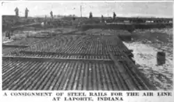 The section of the main line that was actually built, 17.5 miles (28.2 km), ran from South La Porte westwards to a location north of Woodville named Goodrum after George C. Goodrum, a major shareholder from Fall River, Massachusetts.[17] There were three railroad crossings in this distance, over the Pere Marquette Railway, Monon Railroad and the Wabash Railroad. Each of these was provided with a heavy girder bridge, approached by immense fills to keep the gradients down. The fill material came from two deep cuts on the route. The track was built to steam-road standards, allegedly with 85 pound (38.5 kg) rail and white oak ties -in fact, 60 pound (27 kg) rails were used.[14] Every sixth tie was extra long to accommodate the future third conducting rail, although a trolley wire was strung to power the cars as a temporary measure. Only a single track was laid, although there was space for a second.[8] Investors were taken out to view these two portions of the line in operation, and the continuing work. However, further progress continued to be slow and the depression of 1907–1908 worsened the financial problems arising.