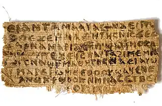 Leo Depuydt of Brown University found it ridiculous that in the Gospel of Jesus' Wife, the word 'my' in the phrase "my wife" is written in bold, as if to stress the idea that Jesus was married. Depuydt also said that he had never seen bold writing used in a single Coptic text before. He wrote: "The effect is something like: 'My wife. Get it? MY wife. You heard that right.' The papyrus fragment seems ripe for a Monty Python sketch... . If the forger had used italics in addition, one might be in danger of losing one's composure."[42] Christian Askeland's linguistic analysis of the text shows that it is in a dialect which fell out of use well before AD 741. He concluded that the text must have been written on a fragment of medieval papyrus by a modern forger.[16] Dr. Askeland also found it suspicious that the author of the fragment wrote the same letter in different ways.[39] In addition, Askeland showed that the fragment is "a match for a papyrus fragment that is clearly a forgery." This second fragment, containing part of the Gospel of John, belongs to the same anonymous owner, and is now overwhelmingly considered a fake. This is because each line on the fragment of the Gospel of John appeared to have been copied from every second line of an online translation of the gospel in an ancient Coptic dialect called Lycopolitan, necessitating an improbable scenario whereby the text, if it were genuine, had been coincidentally written on papyrus exactly twice as wide as the online translation, as well as every word (indeed, every letter) being precisely the same size as those written in the online translation. In addition, the Lycopolitan language died out prior to the sixth century, and the John fragment was carbon-dated to somewhere between the seventh and ninth centuries. Askeland argues that the John fragment was written by the same person, in the same ink, and with the same instrument as the Gospel of Jesus' Wife.[16][40] Professor King felt that these concerns were legitimate, but that there was still a chance that the gospel was authentic.[39] The Atlantic reported that despite King's reservations, the text was widely considered a fake.[7] King later conceded, saying that evidence suggests that the Gospel of Jesus' Wife is a forgery.[6]