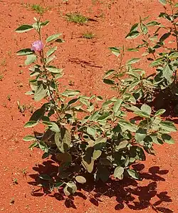 Gossypium australe is an endemic woody shrub, related to cotton, found across a broad swath of northern Australia from West Australia to Queensland.[2] Preferring sandy soils near watercourses, it grows to about two or three feet tall. The leaves are grey and hairy, oval to elliptic, 3 inches (8 cm) long and soft to the touch. Flowers are around 1โ2 inches (3โ5 cm) long and present a pale pink mauve 'rose' with a deeper shade at the centre. Fruit are hairy, spherical and contain a bristly seed one-sixth inch (0.4 cm) long.[3]