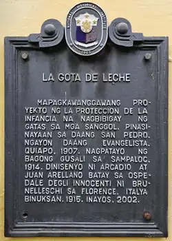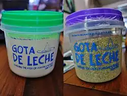 Gota de Leche (lit. A Drop of Milk[1]) is a foundation started by Trinidad Rizal (sister of Philippine National Hero, Dr. José Rizal) and Concepción Felix in 1906 that primarily aims to provide nutritional and medical needs of indigent Filipino mothers and their children. Founded by La Protección de la Infancia Inc., the foundation continues to deliver daily milk rations to Filipino infants