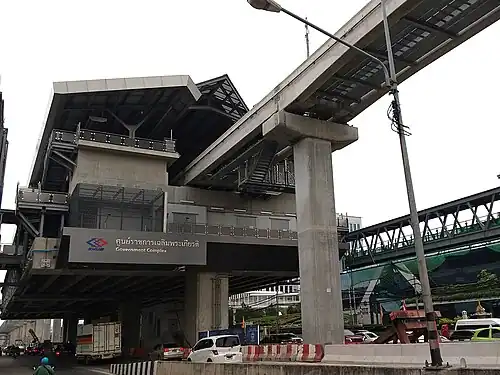 Government Complex station (Thai: สถานีศูนย์ราชการเฉลิมพระเกียรติ, RTGS: Sathani Sun Ratchakan Chaloem Phrakiat) is a Bangkok MRT station on the Pink Line. The station is located on Chaeng Watthana Road, near the Chaeng Watthana Government Complex in Lak Si district, Bangkok.[1] The station has four exits.[2] It opened on 21 November 2023 as part of trial operations on the entire Pink Line.[3][4]