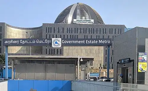 Government Estate is an underground metro station on the North-South Corridor of the Blue Line of Chennai Metro in Chennai, India. This station serves the neighbourhoods of Chepauk, Triplicane and Chintadripet. The station is named so because of the presence of the Omandurar Government Estate in the vicinity. This metro station is very much useful for visitors to Ritchie Street and Ellis Road which are two very big commercial streets in Chennai city. The station was opened for public on 10 February 2019. However, some portions of the construction work remains incomplete on the date of inauguration.[1]
