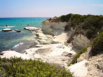 The Governor's Beach (Greek: Ακτή του Κυβερνήτη) is located partly in the Larnaca and in the Limassol region. It is a 2 km shoreline, with sandy beaches, deep crystal waters and a blue flag waving. The area is unknown to most locals and tourists.[1] Because of the structure of the shoreline, consisting of well-hidden small coves, it is one of the few semi-official[2] nudist beach spots in Cyprus.