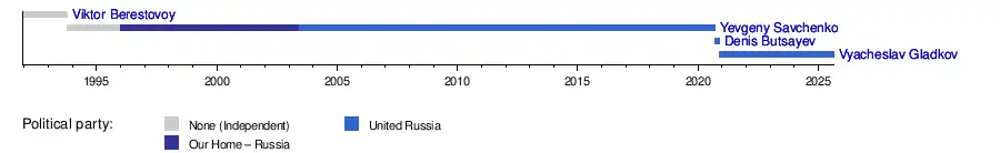 Berestovoy's successor Yevgeny Savchenko, had previously worked as deputy head of the Main Directorate of Crop Production of the Ministry of Agriculture. In office from October 1993 to September 2020, he is the longest-serving Russian governor in post-Soviet history.