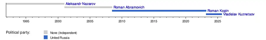 Nazarov was succeeded by Roman Abramovich, a Russian oligarch and member of the 3rd State Duma from the Chukotka constituency. According to media reports, he invested a lot of his own funds in the development of the region and improving the living standards of the local population.[2] Abramovich asked president Putin to accept his resignation at least two times: in December 2006, and in the fall of 2007, but these attempts were unsuccessful.[3] He resigned in July 2008 and was succeeded by Roman Kopin, former head of Bilibinsky District.[4] Kopin was succeeded by Vladislav Kuznetsov, after the former resigned in March of 2023.