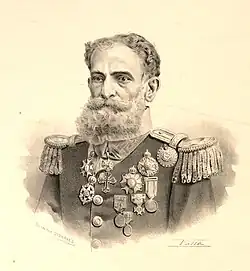 During the Ragamuffin War, the biggest civil war in Brazilian history, the province had two parallel governments, one loyal to the emperor and the other to the rebels, in the figure of the president of the Riograndense Republic.[114][115][116][117] When the conflict erupted in 1835, President Antônio Rodrigues Fernandes Braga was deposed by the farrapos.[118][119] The 1843 Constitution of the Rio-Grandense Republic specified the powers of the president in its Title V, Chapter I. Elected by the General Assembly for a four-year term, he could not be reelected consecutively. He was responsible for the administration, nominating magistrates, ministers, senators, ambassadors, military commanders, and deciding on laws approved by the legislature.[120][121] Only Bento Gonçalves da Silva and Gomes Jardim were presidents of the Rio-Grandense Republic.[122] In 1845, Duke of Caxias, the provincial president appointed by the emperor, managed to pacify the province and the war came to an end with the signing of the Treaty of Poncho Verde.[123]