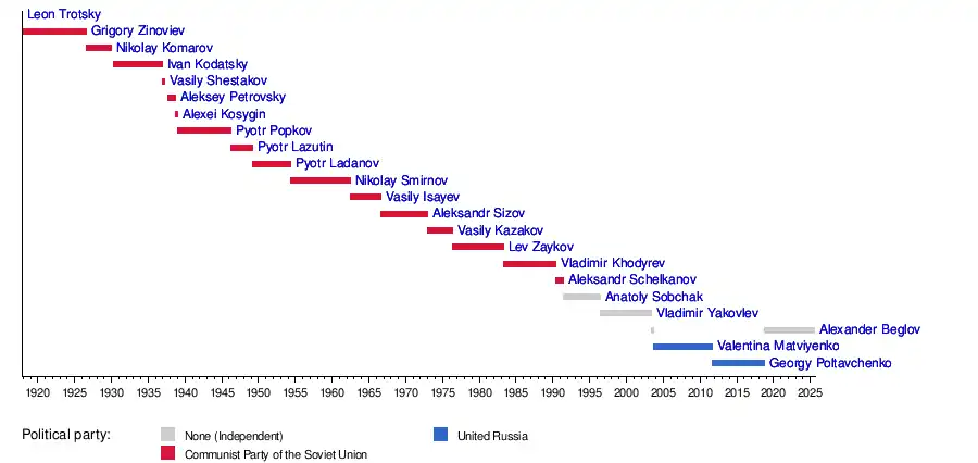 Under the Soviet regime, until 1991 the head of the city administration was called chairperson of the executive committee. Between 1991 and 1996, the head of the administration was called Mayor after which they were called Governor. Between 1991 and 2006 the mayor/governor was elected by direct vote of city residents. Between 2004 and 2014, the governor was nominated by the President of the Russian Federation and approved (or disapproved) by the City Legislative Assembly,[1] and since 2014 the governor has been elected by popular vote of city residents.