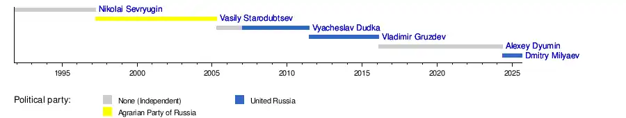 In 1991, the post of the Head of the Administration of Tula Oblast was established, who was appointed by the President of Russia. On 28 September 1995, a new Charter of Tula Oblast was adopted, in which the post of Head of the Administration was renamed to Governor, who was elected by the people of the Tula Oblast. At the same time, the powers of the Governor before the elections were carried out by the Head of the Administration Nikolai Sevryugin, who was appointed by the President.[4]