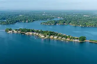 Governors Island is one of the few islands with permanent residents on Lake Norman, in Westport, a community in Catawba Springs Township, in Lincoln County, North Carolina, US. The island is a small, wealthy community located 20 miles northwest of Charlotte, North Carolina, and less than half a mile from mainland Westport in the piedmont of North Carolina. This community is in the Denver, North Carolina, zipcode of 28037. The largest subdivision nearby to the north is SailView, a Crescent Community, also in Denver, North Carolina. The total population estimate for the island was less than 200 residents as of 2010.