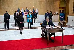 In December 2016, Baker's administration undertook an economic development mission in Israel.[89] During the mission, Baker signed an agreement with Israeli Chief Scientist Avi Hasson to foster research and development cooperation between the Massachusetts and Israeli governments,[90] the Massachusetts Technology Collaborative and an Israeli non-profit organization signed a cybersecurity agreement,[91] and Baker met with Israeli Prime Minister Benjamin Netanyahu.[92]