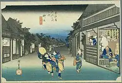 Goyu-shuku was established in 1601, at the behest of Tokugawa Ieyasu. At its most prosperous, there were four honjin in the post town, though there were never less than two at any point. The classic ukiyo-e print by Andō Hiroshige (Hōeidō edition) from 1831 to 1834 depicts the main street of the post town at dusk, with aggressive female touts (for which the post station was infamous) attempting to drag travellers into teahouses and inns for the night.[1]