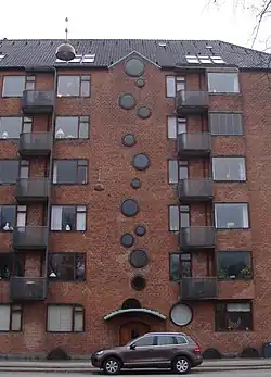 Built in 1935–36 to designs by Ib Lunding, the apartment building at Nr. 7-9 is in spite of its robust Functionalist style known as the Champaign House due to its irregularly placed windows of the staircase. It was heritage listed in 1997.[7]