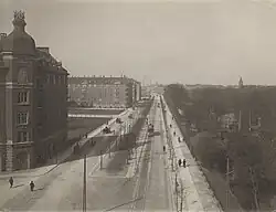 The triangular area between Esplanaden, Store Kongensgade (Nyboder) and Kastellet was from 1782 home to a ropewalk. It was later converted into a Guard Hussars barracks.[1] At the turn of the 20th century, it was decided to demolish the outdated installation to make way for high-end apartment buildings. A competition was held and a plan for redevelopment of the area was adopted by the city on 29 June 1903. Demolition of the barracks buildings began on 1 November 1905 and the area was sold to private investors shortly thereafter.[2] A broad boulevard inspired by those of Haussmann in Paris replaced the outer moat of Kastellet and the smaller streets in the area were all named after localities associated with the island of Bornholm. The plan required all apartments facing Grønningen to have between six and 12 rooms while the rest of the apartments should have at least five rooms.