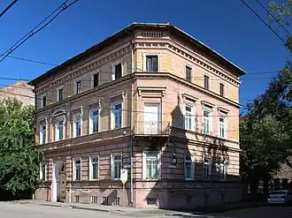 The building is designed in an eclectic historicist style. A beveled corner, created by the junction of the facades, forms a small, angled corner facade. The ground floor is adorned with bossages, lending the structure a sense of solidity and monumentality, and serving as a visual foundation for the upper levels. A wrought-iron balcony graces the corner facade, contributing an element of elegance and dynamic character to the overall composition.
